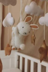 Das Häschen schwebt auf den sanften Wölkchen in die Nacht. Mit unserem handgefertigten Baby-Mobile werden die letzten Minuten des Tages zu einer entspannten Reise ins Land der Träume. Auch beim Aufwachen haben die Kleinen direkt einen Bezugspunkt, was für ein harmonisches und geborgenes Aufwacherlebnis sorgt.