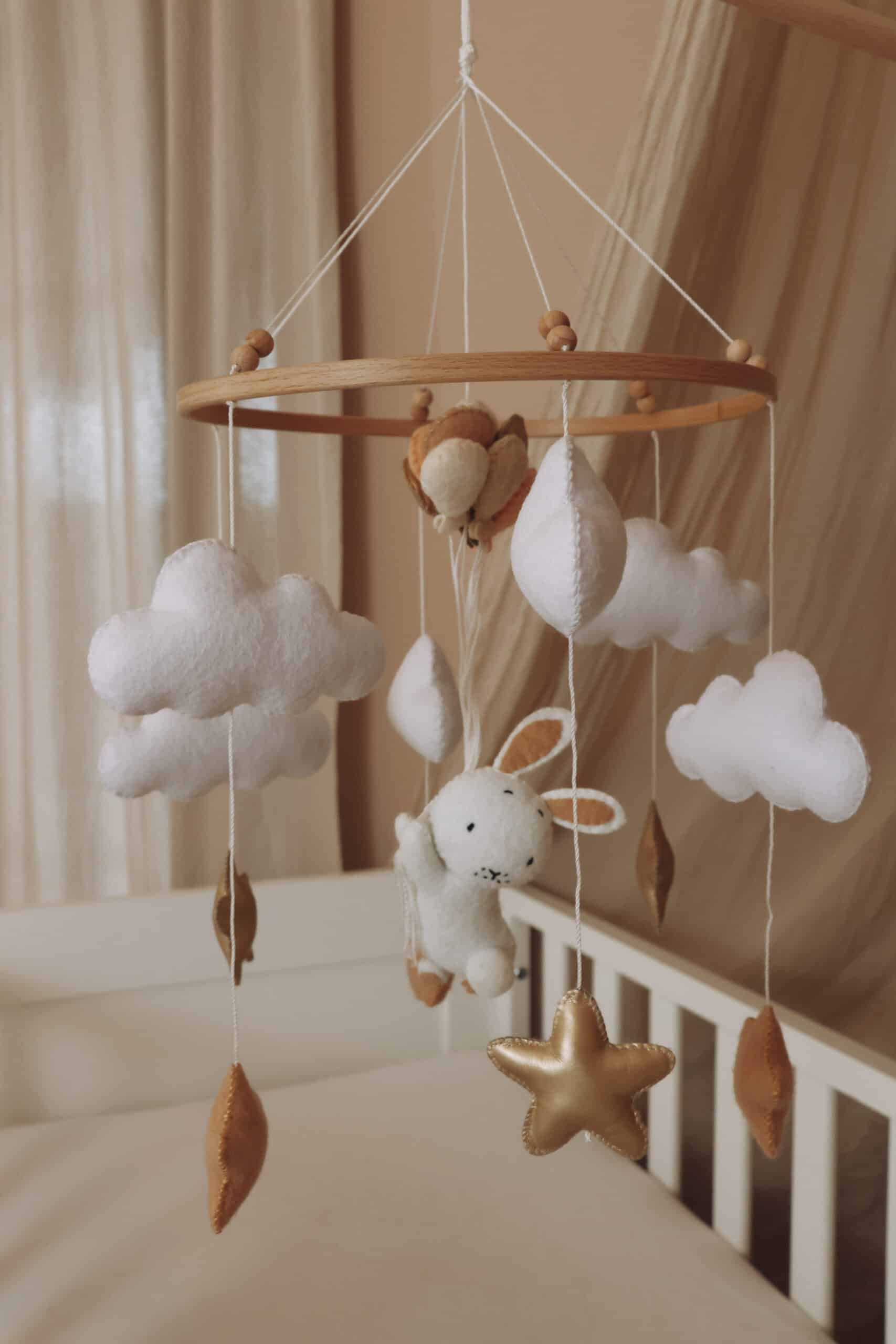 Das Häschen schwebt auf den sanften Wölkchen in die Nacht. Mit unserem handgefertigten Baby-Mobile werden die letzten Minuten des Tages zu einer entspannten Reise ins Land der Träume. Auch beim Aufwachen haben die Kleinen direkt einen Bezugspunkt, was für ein harmonisches und geborgenes Aufwacherlebnis sorgt.